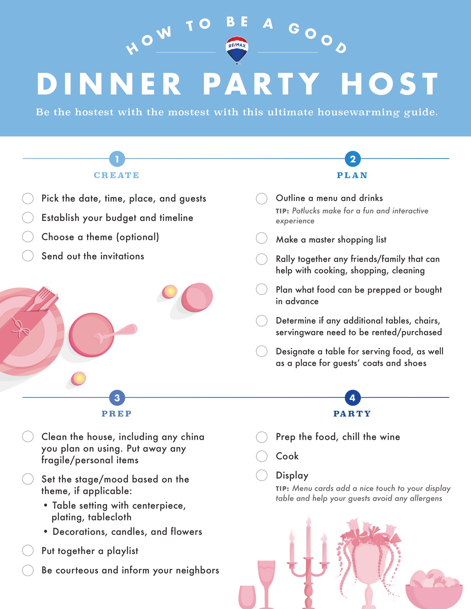 Because when you book a dinner party at a certain restaurant, you are not only paying for the food listed below is a chronological timeline along with a checklist that provides a list of requirements on. Jaclyn johnson's party planning checklist is your secret to entertaining en masse — this holiday a dinner party isn't a yoga class, but setting an intention can help guide the atmosphere of the event. So, whether you're planning an elegant dinner party or a casual birthday bash, we have all the details to ensure. Not sure if you'll have eight people or 18? Dinner parties give you an exceptional chances to interact as well as pamper guests.